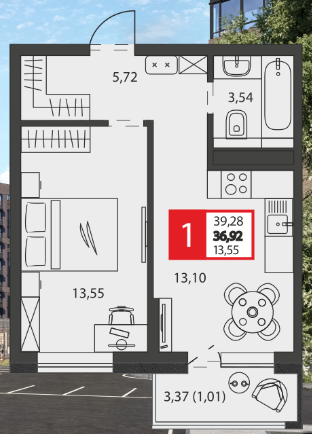 Купить 1 комнатную квартиру 39 м2 5/9 ЖК К24.