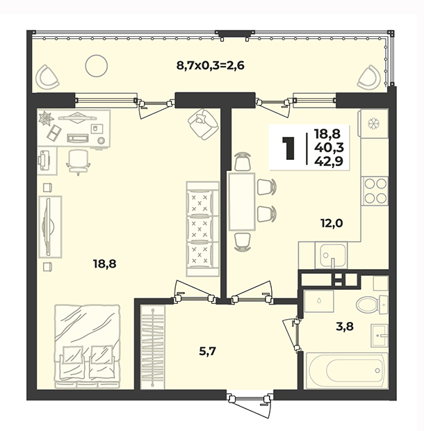 Купить 1 комнатную квартиру 42 м2 5/9 ЖК Лето.