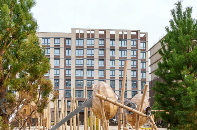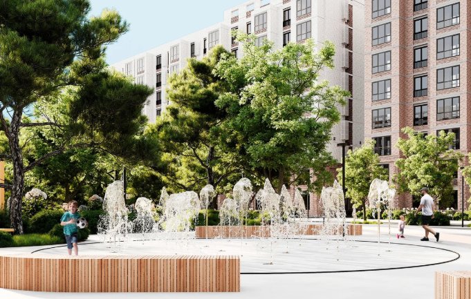 На территории комплекса предусмотрены беговые дорожки для занятий спортом,фонтан в центре двора,зона с лежаками, детский городок для разных возрастов,закрытые велобоксы и зоны для работы,оснащенные зарядными устройствами.