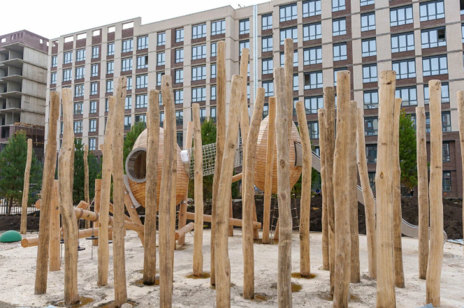 На территории комплекса предусмотрены беговые дорожки для занятий спортом, фонтан в центре двора, зона с лежаками, детский городок для разных возрастов, закрытые велобоксы и зоны для работы, оснащенные зарядными устройствами.