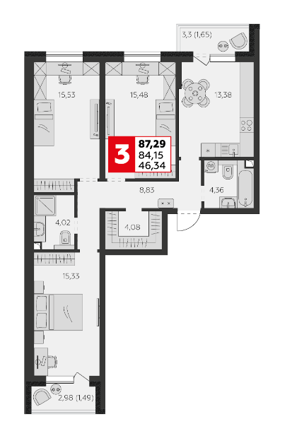 Купить 3 комнатную квартиру 87 м2 8/9 ЖК К24.