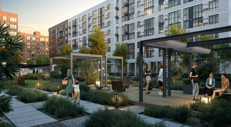 Одной из сильных сторон проекта остаётся организация внутреннего пространства комплекса. Придомовая территория проектируется как единая жилая среда, где учтены интересы жителей разного возраста. Здесь предусмотрены: озеленённые зоны отдыха со скамейками; современные детские площадки с безопасным покрытием; спортивные площадки для активных видов спорта (футбол, баскетбол, теннис);workout-зоны для тренировок на свежем воздухе; отдельные площадки для выгула домашних животных.