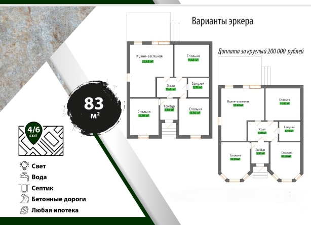 Дома доступны с ремонтом или в предчистовой отделке. В предчистовой: стяжка, штукатурка, электрика с теплым полом, коммуникации и отопление. Планировки разнообразны, от экономичных до премиум. Территория облагорожена, бетонные дороги. Ипотека, включая сельскую, доступна.